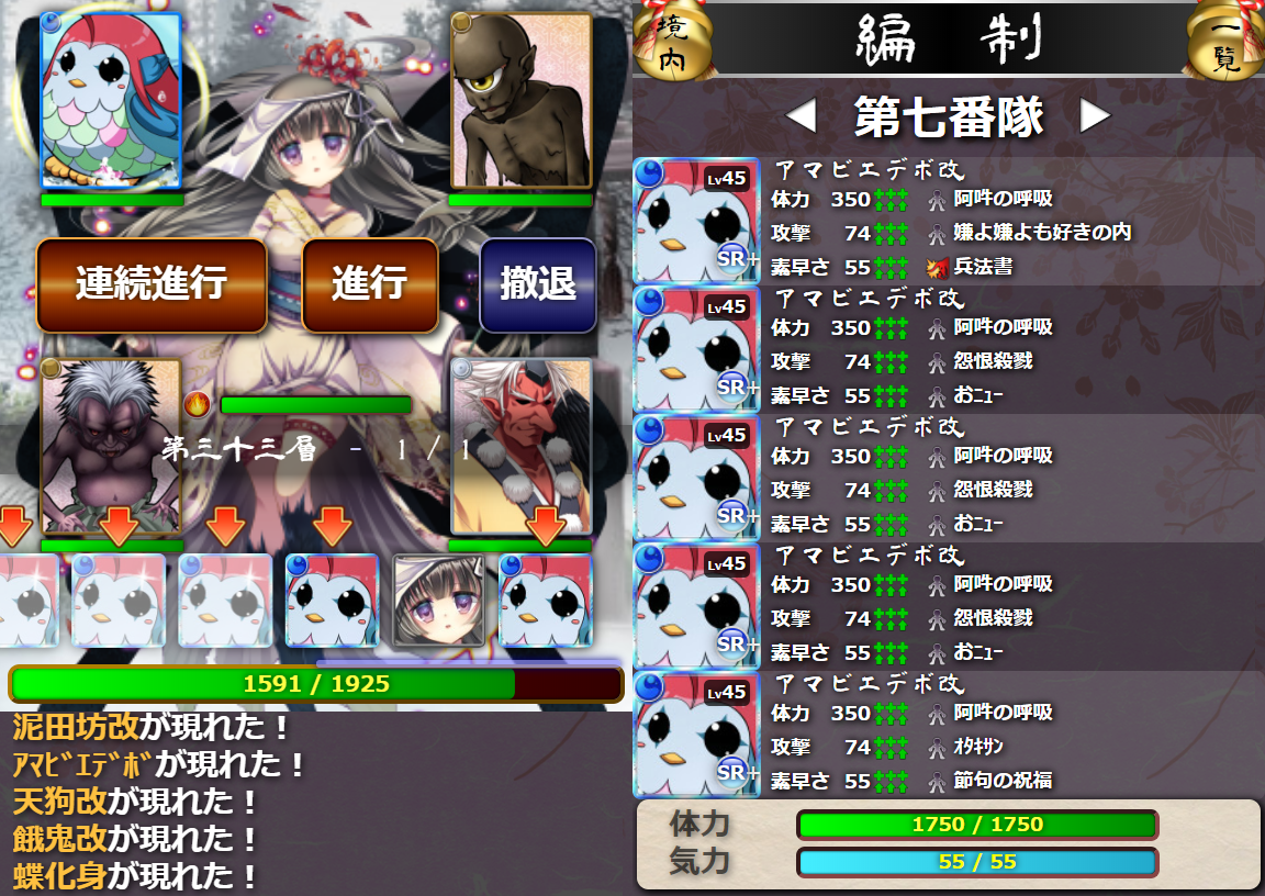 百鬼夜行深層のボスラッシュ猿女の舞でボスのスキル抑え込めるのか。まだまだ編成の調整の余地があるなあ。