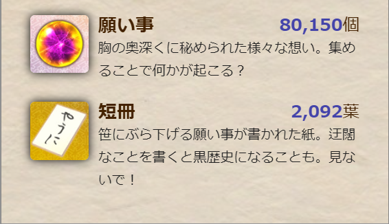 今回の新規登録はアマテラスだけだが、既存組のいくつかの願い事札に