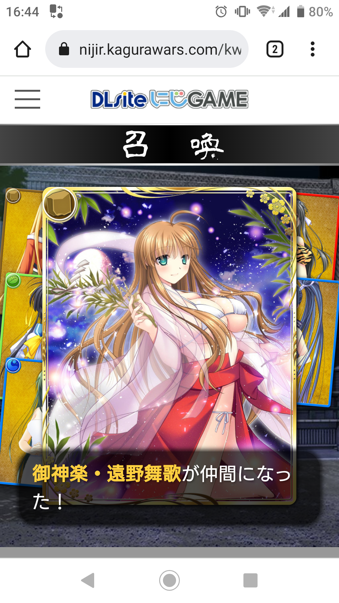 あれ?御神楽舞歌さんこれひょっとして脱げたらosiri見えちゃうアングルじゃないですか?(豆召喚でゲットできる可能性は0ではないので逸る気持ちを抑えている。なお1000コインは駄目でした)