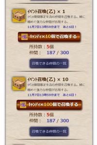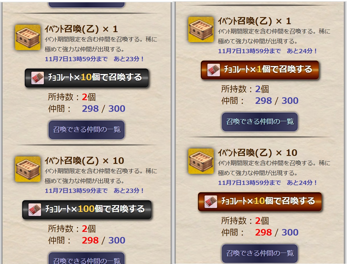 おそらくですが「イベント召喚」のチョコレートとキャンディが逆です。現在はチョコレート1つで1回召喚できますが、正しくは10個で1回召喚だと思われます。気がつかづにチョコレート20個使って20回召喚してしまいました。申し訳ございません。ご確認をお願いいたします。そして間違えて召喚した分はこちらのミスでもありますのでご指示を頂けましたらその通りいたしますのでよろしくお願いいたします。 -