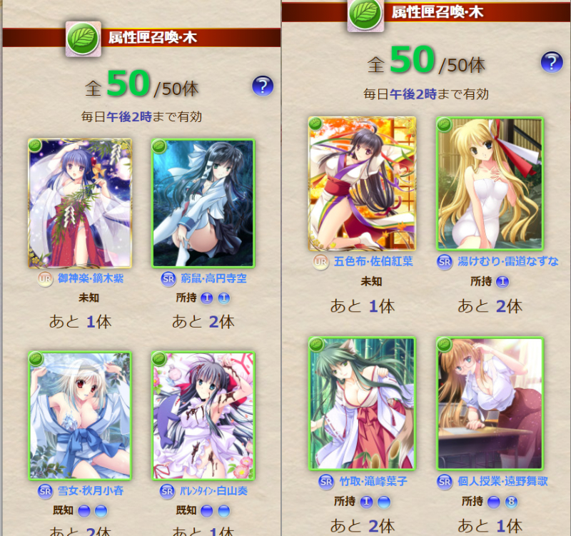 今、日替わりの召喚候補を作ったら巫女舞・雷道なずなと緊縛・清家澄佳がでました。