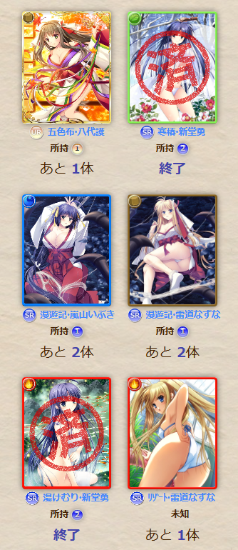 五色布・護含めURが来なかったのは残念でしたが、湯けむり・勇もコンプされたようで今回は勇と縁深かったみたいですね。