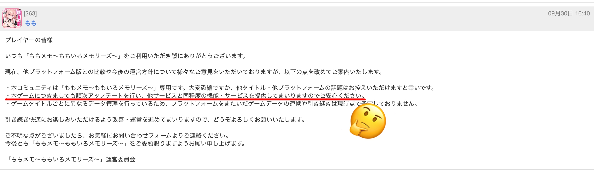 この運営は、都合の悪い事態には沈黙する印象がある。対処します、とかの返事も無く手を加えた場所だけ報告してる感じ。